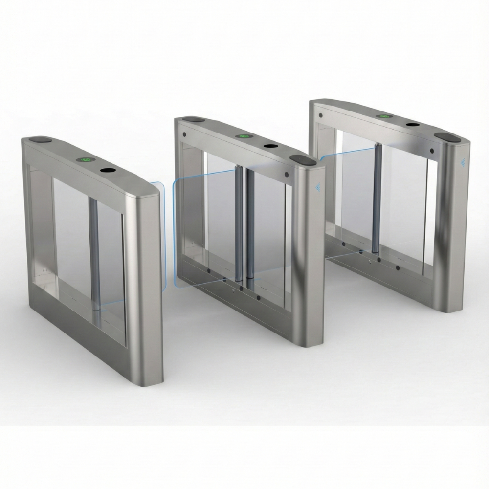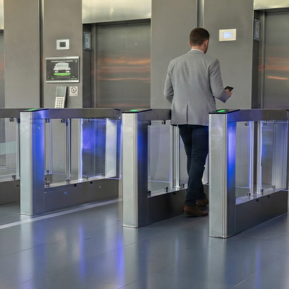Barreras batientes de diseño robusto y minimalista para el control de accesos peatonales, diseñadas para soportar un alto flujo de personas de manera continua. Utilizan tecnología motorizada Brushless, lo que garantiza una apertura ágil, silenciosa y de alta durabilidad, permitiendo el paso de 35 a 50 personas por minuto. Fabricadas principalmente en acero inoxidable con paneles de acrílico o vidrio, estas soluciones integran seguridad avanzada mediante sensores infrarrojos anti-atrapamiento y funciones anti-seguimiento. Son sistemas altamente versátiles, compatibles con múltiples tecnologías de validación como reconocimiento facial, códigos QR, tarjetas ID e IC. Su diseño permite la integración en entornos corporativos y comerciales, ofreciendo configuraciones de acceso universal para cumplir con normativas de inclusión y seguridad contra incendios mediante apertura automática por corte de energía.